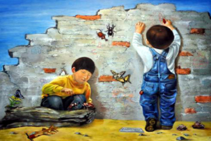 這次主題我想以我小時候的童年來做表達,畫面中兩個天真無邪的小朋友,一個是哥哥,一個是我,我們正在和這些大自然的昆蟲玩耍。我認為牠們不僅是大自然的美,更是我童年回憶的同伴。蹲在牆角昆蟲的是哥哥,在一旁塗鴉的是我,我想把我發現到的畫在牆上記錄著大自然的美,雖然手上畫的並不是真的,而是塗鴉,不過在我心中牠們永遠都是那麼的真實那麼的值得回憶。 |