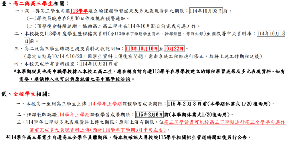 >>本校114學年上學期建置學生學習歷程檔案工作期程及注意事項(1141205修正版)