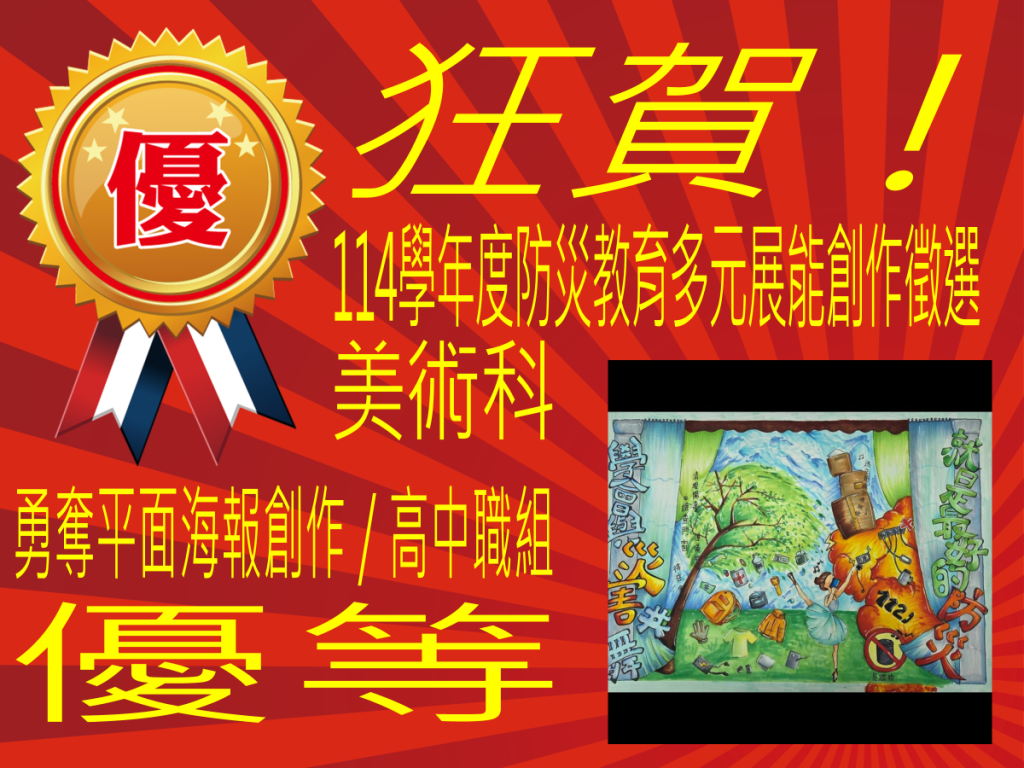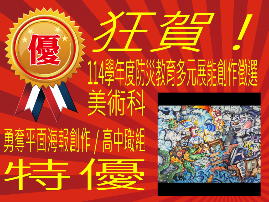 本校美術科參加2025 高雄市政府教育局防災教育多元展能創作徵選 (平面海報創作組 高中職組)榮獲佳績!作者: yenan / 2025-12-26 2025-12-26 特優 : 美二真 吳○佑 優等 : 美二真 鄭○菁 甲等 : 美二真 林○涵、張○嘉 指導老師:李菁菁 全體師生同賀!!