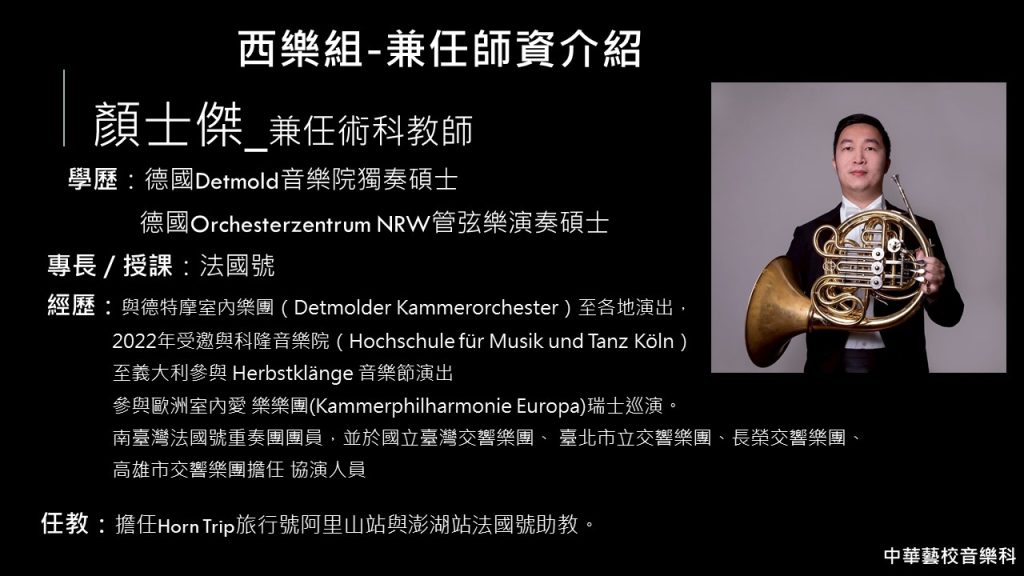| 教師(管樂組) | 顏士傑 | 德國Detmold音樂院獨奏碩士 德國Orchesterzentrum NRW管弦樂演奏碩士 | 法國號 |