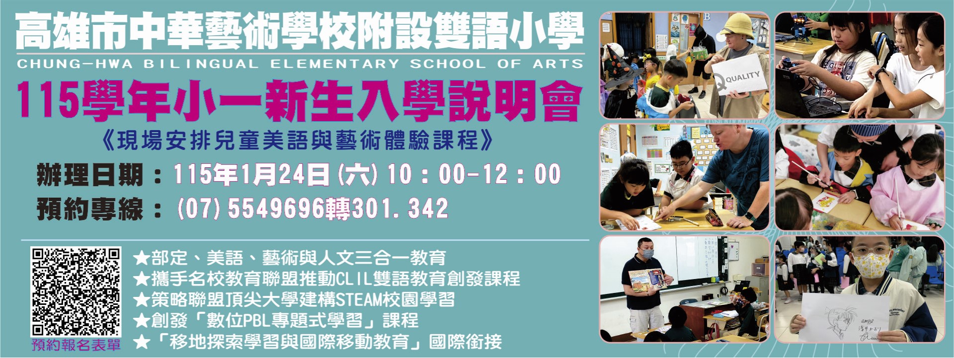 國小網頁廣告橫幅006國小網頁廣告橫幅005國小網頁廣告橫幅004新生說明會網頁橫幅1150124_1920x721國小網頁廣告橫幅003國小網頁廣告橫幅001國小網頁廣告橫幅002新生說明會網頁橫幅1150124_1920x721廣告橫幅09廣告橫幅10廣告橫幅11 招生資訊 ▶︎ 【NEWS!】115學年度新生、114學年度轉學生報名表 2025-09-19 更多… 最新消息 ▶︎ **重要公告**期末暨寒假行事曆 2025-12-29 ▶︎ 【媒體報導】三年後全班一半考上雄中雄女 華藝附小好強! 2025-08-06 ▶︎ 漾新聞|飆英語用戲劇聊科技 AI劇碼《機器人日記》反思人類五感 2025-05-28 ▶︎ 飆英語用戲劇聊科技 AI劇碼《機器人日記》反思人類五感 2025-05-28 ▶︎ 高雄市政府消防局114年防火宣導 2025-05-08 更多… 榮譽榜 ▶︎ 【恭喜】3B林○澄、王○文、余○橙、邱○熙、李○和、5B蘇○蓓、方○欣、 6A林○宇、王○棨、李○蓁、蘇○心、劉○寧、謝○希 參加114年度「Cool English口說王比賽」榮獲口說王獎 2025-12-31 ▶︎ 【恭喜】4A曾○媗、4B林○妍 參加高雄市114年度國民中小學人權教育宣導學生學藝競賽,榮獲中年級海報創作組佳作 2025-12-31 ▶︎ 【恭喜】5A趙○蓁、5B趙○蓁參加114年度Cool English英閱王比賽,榮獲英閱王獎 2025-12-31 ▶︎ 【恭喜】本校國小部參加AERC亞洲機器人運動競技大賽,相撲機器人項目,榮獲第五名、佳作 2025-12-31 ▶︎ 【恭喜】本校國小部參加AERC亞洲機器人運動競技大賽,軌道機器人項目,榮獲第一名、第二名、佳作 2025-12-31 更多…